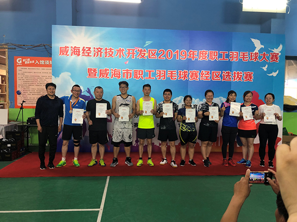 由区总工会和教体处共同举办的威海经济技术开发区2019年度职工羽毛球比赛暨威海市“喜迎国庆七十周年”全市职工羽毛球赛经区选拔赛决赛,于6月15日、16日在永利羽毛球馆举行。公司组队参加了此次比赛,取得了团体总分第五名、刘志红获女单第四名、秦垒获男单第五名的好成绩。